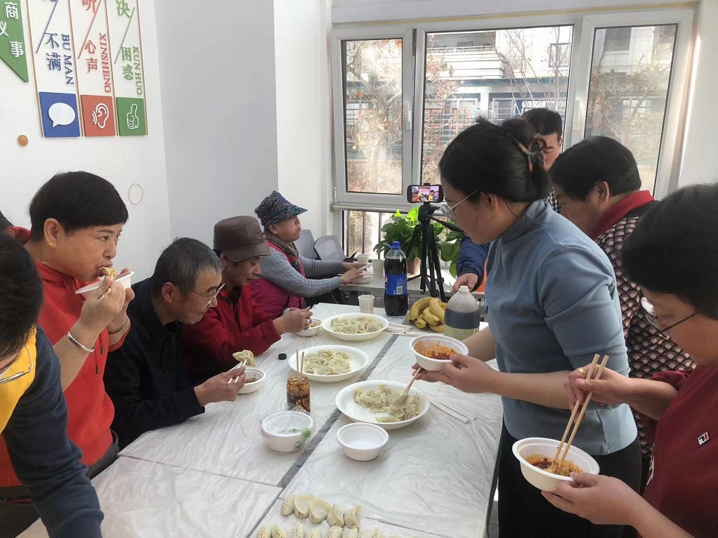 活動(dòng)中,11名居民群眾、社區(qū)工作人員和集團(tuán)公司志愿者們一起切菜剁餡,一起包餃子、煮餃子,忙得不亦樂(lè)乎。當(dāng)熱騰騰的餃子端上桌,大家圍桌而坐,共享香噴噴的餃子,感受著濃厚的節(jié)日氛圍。