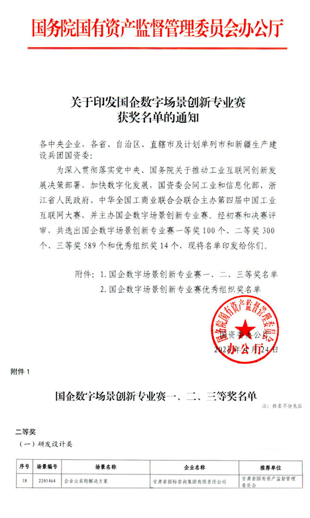 近日,國務(wù)院國資委公布了首屆“國企數(shù)字場景創(chuàng)新專業(yè)賽”獲獎名單。甘肅工程咨詢集團(tuán)組織推薦的“甘招企業(yè)云采購平臺”創(chuàng)新場景,在全國2007家參賽企業(yè)推薦的3277個場景中脫穎而出,榮獲二等獎!