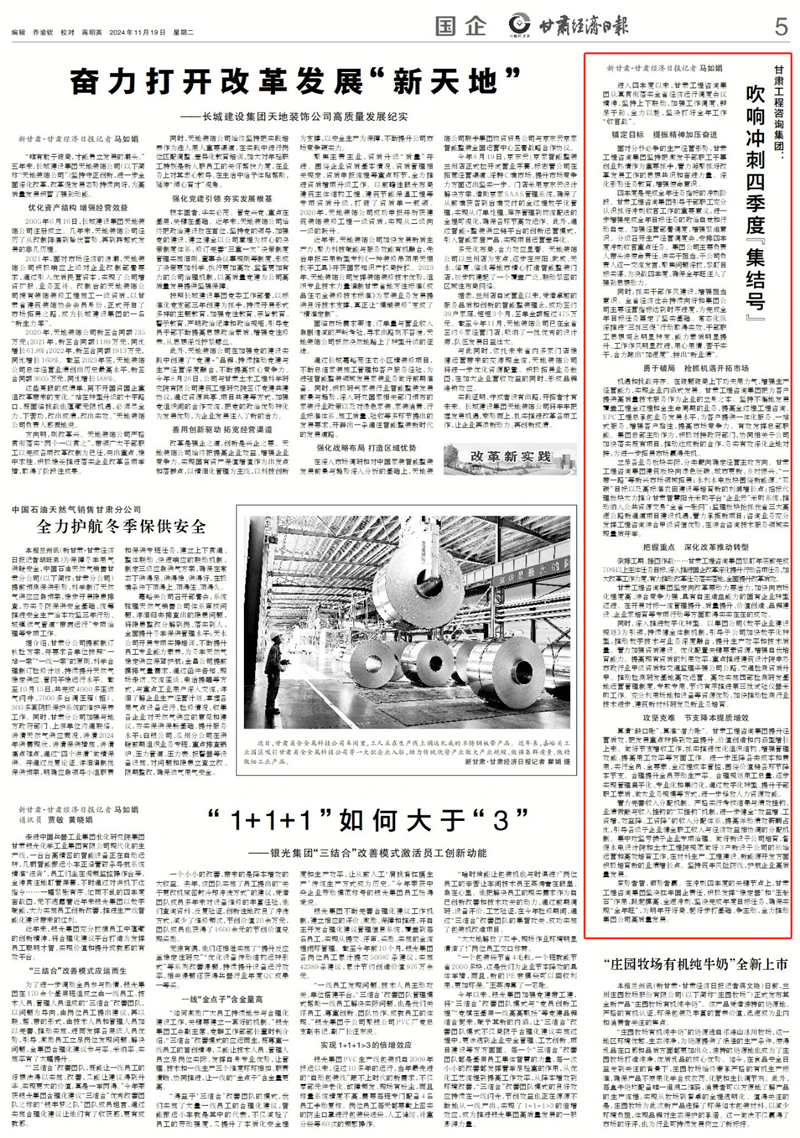 甘肅工程咨詢(xún)集團(tuán)堅(jiān)定向改革要?jiǎng)恿σ盍?,加快向市?chǎng)化程度高、綜合競(jìng)爭(zhēng)力強(qiáng)、具有自主造血能力的國(guó)有企業(yè)轉(zhuǎn)型邁進(jìn)。在開(kāi)展對(duì)標(biāo)一流管理提升、質(zhì)量提升、價(jià)值創(chuàng)造、品牌建設(shè)、企業(yè)家培育等專(zhuān)項(xiàng)行動(dòng)等方面取得實(shí)實(shí)在在的成效。