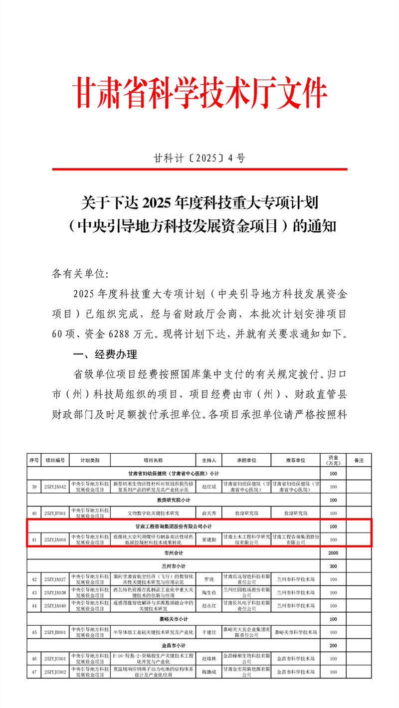 近日,甘肅省科技廳公布了2025年度科技重大專項計劃(中央引導(dǎo)地方科技發(fā)展資金項目)立項名單,甘肅工程咨詢集團土木工程院主持申報的“資源化大宗利用煤矸石制備高活性綠色低碳膠凝材料技術(shù)成果轉(zhuǎn)化”項目成功立項。