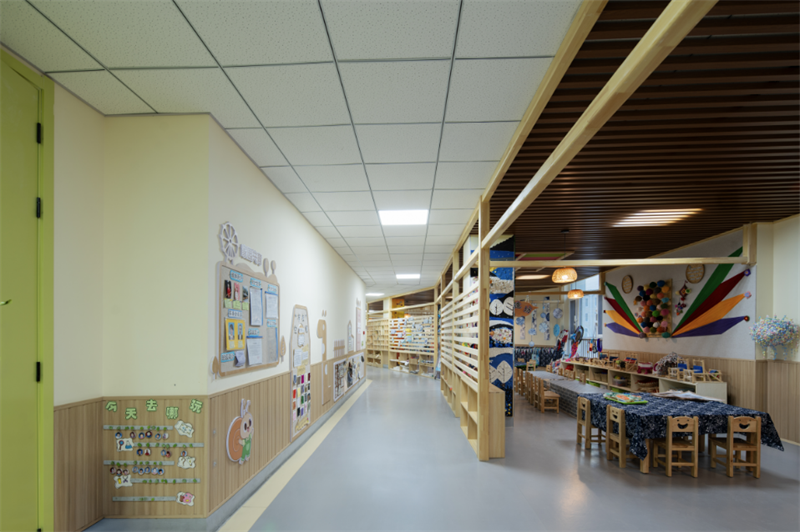 設(shè)計團(tuán)隊(duì)秉承“文化根系·生態(tài)課堂”的核心理念,實(shí)現(xiàn)了三大創(chuàng)新突破:文化傳承創(chuàng)新,巧妙解構(gòu)傳統(tǒng)藏式建筑語匯,以象征性的“煨桑臺”形態(tài)塑造入口空間,并運(yùn)用夯土墻、木質(zhì)格柵等本土材料與工藝,喚醒地域文化記憶。生態(tài)教育融合,充分利用場地自然高差,構(gòu)建多層級生態(tài)活動圈。設(shè)置屋頂農(nóng)場、戲水溪谷、觀星臺等多元互動空間,鋪設(shè)出一條“從土壤到星空”的自然認(rèn)知與探索路徑。兒童友好設(shè)計,深度契合3-6歲兒童行為特征,引入模塊化家具系統(tǒng),并融入光影劇場、交互藝術(shù)墻等智慧化設(shè)施,充分激發(fā)幼兒的好奇心、探索精神與創(chuàng)造力。