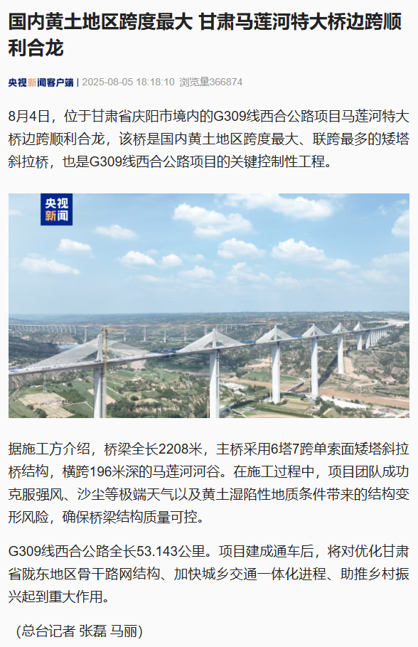 近日,由甘肅工程咨詢集團(tuán)旗下省交通監(jiān)理公司承監(jiān)的G309線西合公路項(xiàng)目建設(shè)取得重大進(jìn)展——馬蓮河特大橋邊跨順利合龍。項(xiàng)目建成后,將進(jìn)一步完善區(qū)域路網(wǎng)結(jié)構(gòu),對(duì)促進(jìn)慶陽地區(qū)經(jīng)濟(jì)社會(huì)發(fā)展具有重要意義。