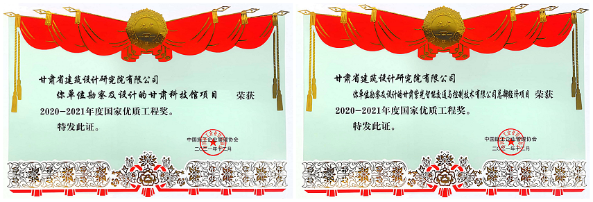 日前,從中國施工企業(yè)管理協(xié)會傳來喜訊,由甘肅省建筑設(shè)計研究院有限公司勘察及設(shè)計的“甘肅科技館項目”和“甘肅紫光智能交通與控制技術(shù)有限公司總部經(jīng)濟(jì)項目”榮獲2020—2021年度國家優(yōu)質(zhì)工程獎。