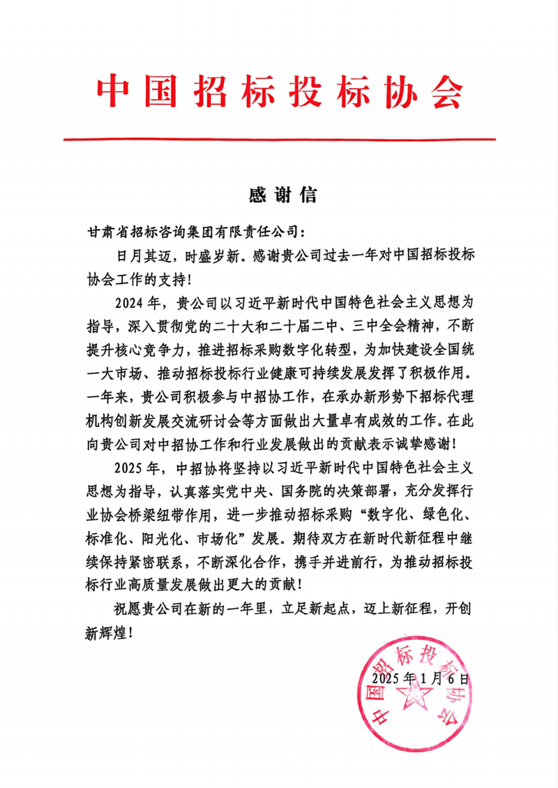 近日,省招標(biāo)集團(tuán)收到來自中國(guó)招標(biāo)投標(biāo)協(xié)會(huì)(下稱“中招協(xié)”)的感謝信,感謝省招標(biāo)集團(tuán)作為中招協(xié)常務(wù)理事單位為招標(biāo)投標(biāo)行業(yè)發(fā)展作出的積極貢獻(xiàn)。