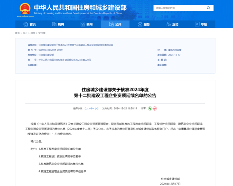 近日,住房城鄉(xiāng)建設部正式發(fā)布了《關于核準2024年度第十二批建設工程企業(yè)資質(zhì)延續(xù)名單的公告》。省建筑設計院建筑行業(yè)甲級、風景園林工程設計專項甲級、市政行業(yè)(給水工程)專業(yè)甲級、市政行業(yè)(熱力工程)專業(yè)甲級資質(zhì)通過核準延續(xù)。